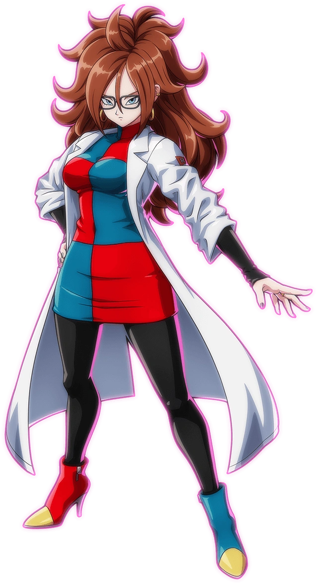 Android 21 (Lab Coat) (人造人間21号 (白衣), Jinzōningen Nijūichi-Gō (Hakui)) is an protagonist fighter of the story mode for Dragon Ball FighterZ, where her evil half, in her true Majin form spliced off is a playable antagonist fighter of the game's storyline. She is a new protagonist fighter design created by Akira Toriyama himself for this specific game.